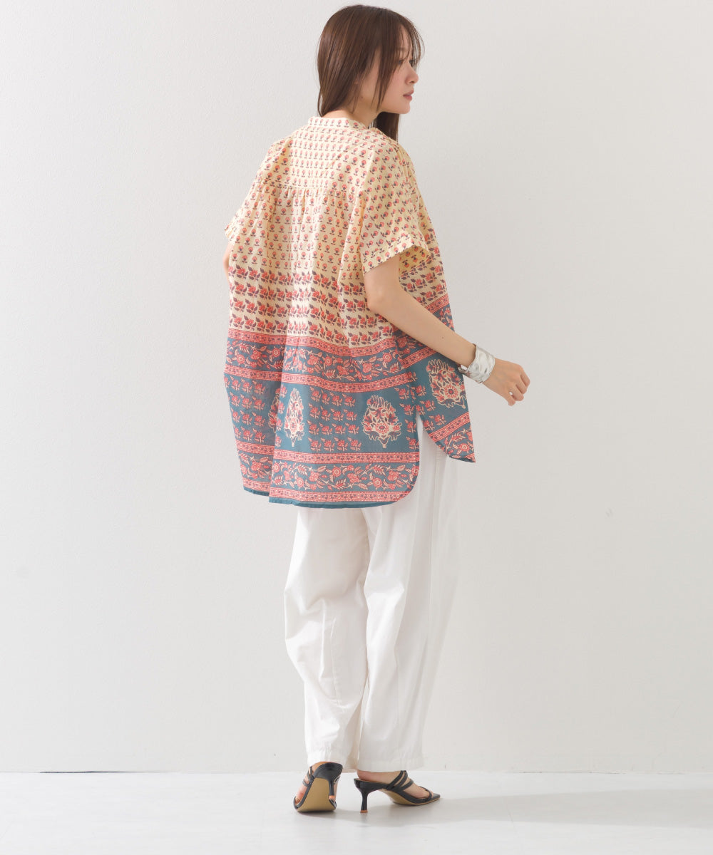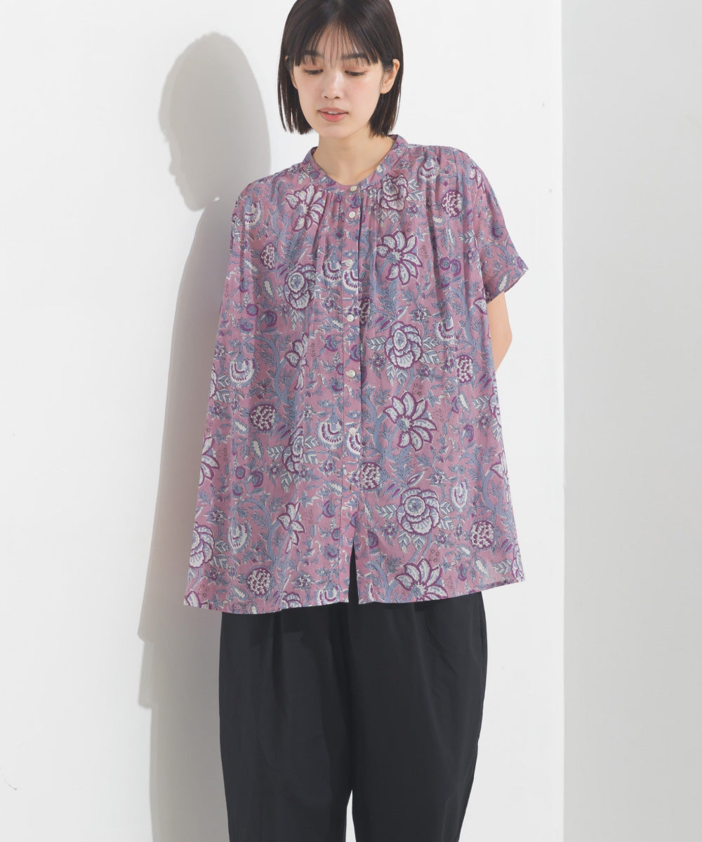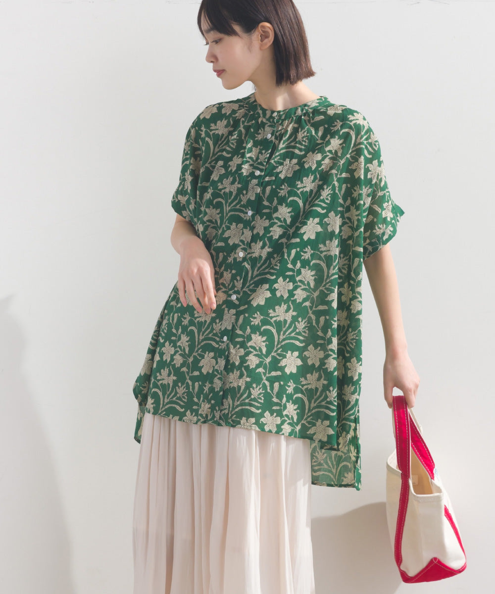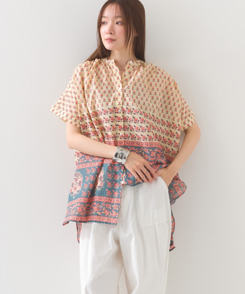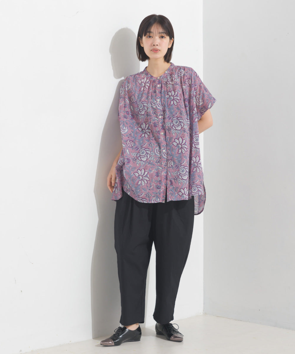 【OMNES】コットンボイル総柄ワイドシルエットギャザー半袖シャツ【1524-4183】