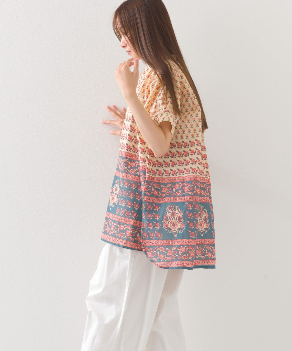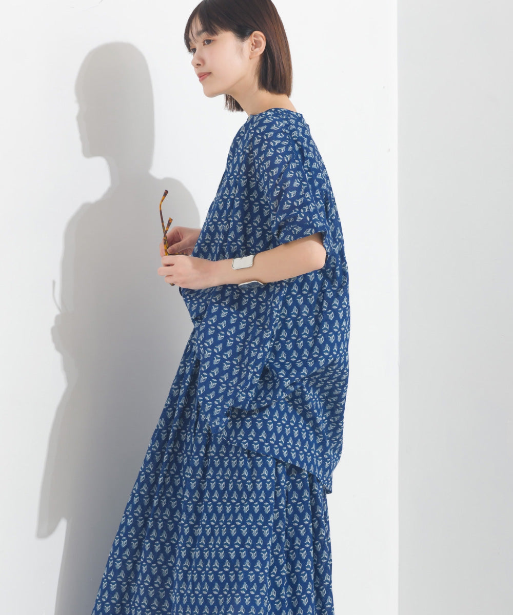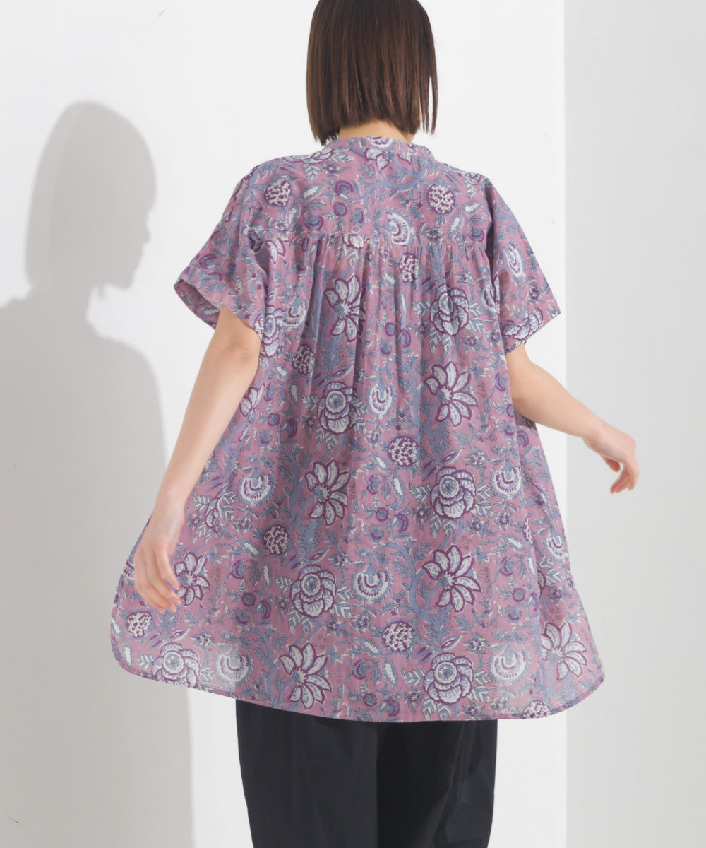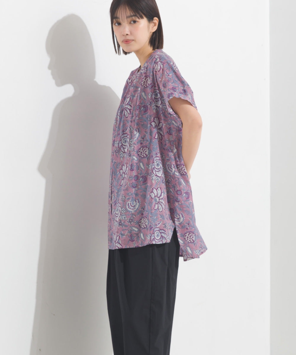 【OMNES】コットンボイル総柄ワイドシルエットギャザー半袖シャツ【1524-4183】