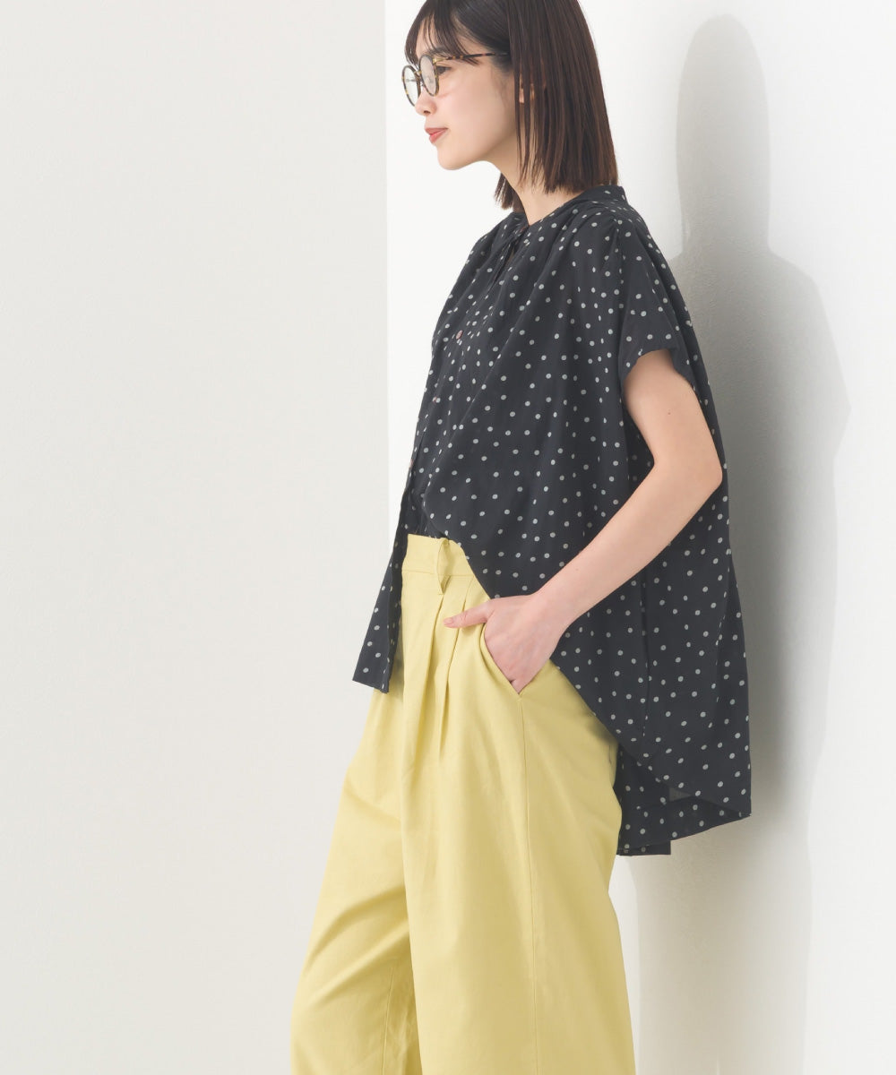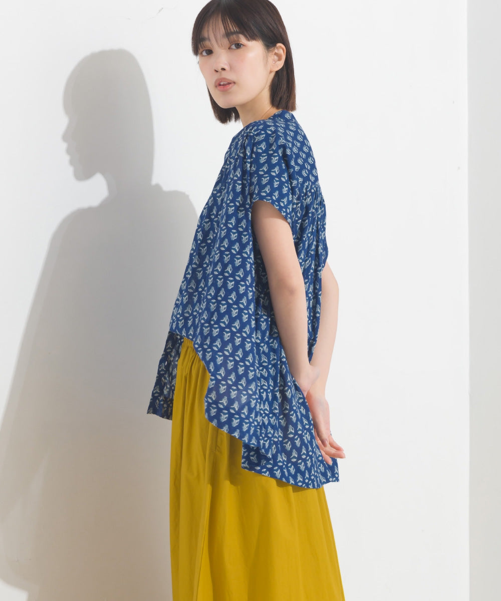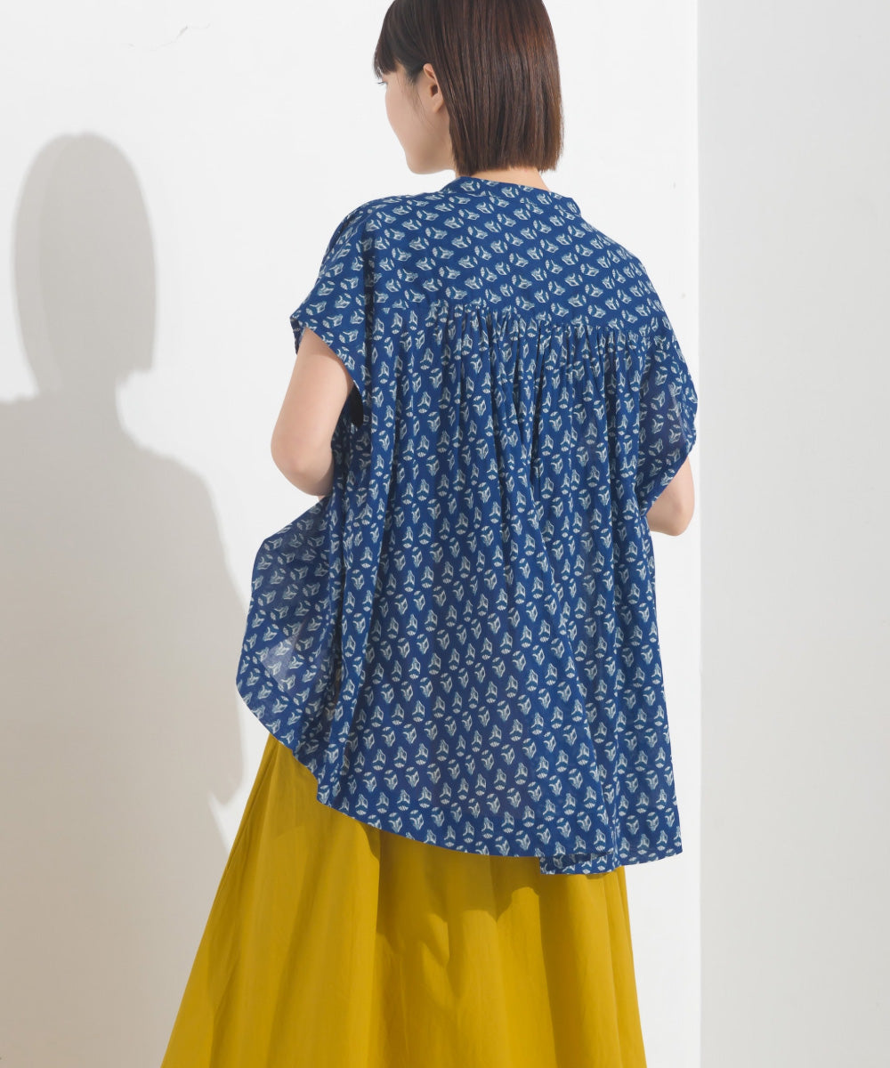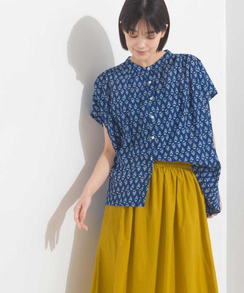 【OMNES】コットンボイル総柄フレンチスリーブギャザーシャツ【1524-4184】