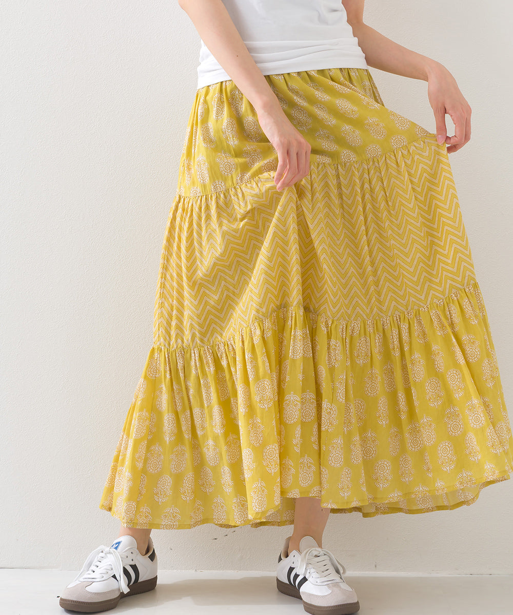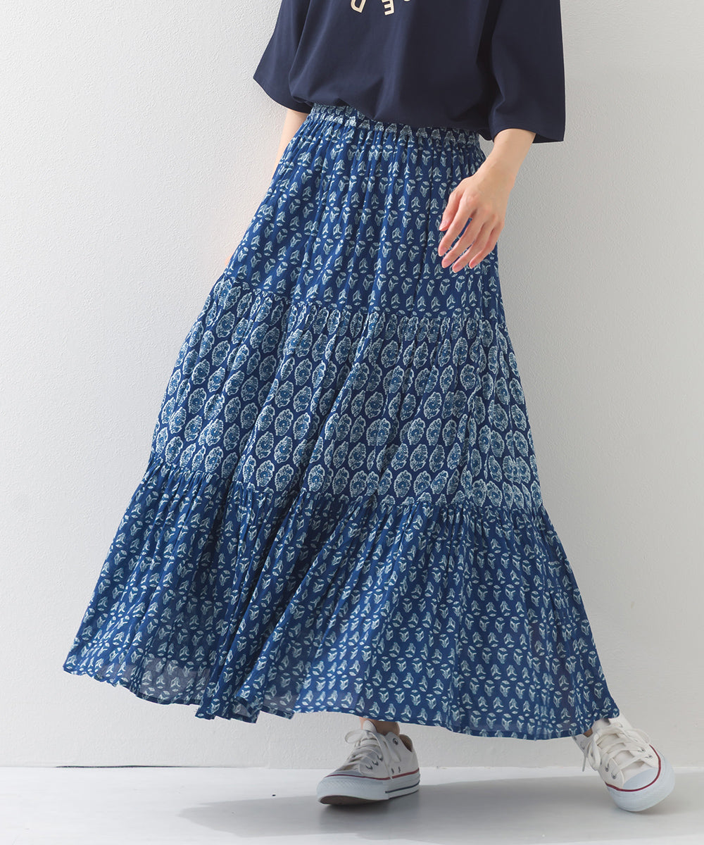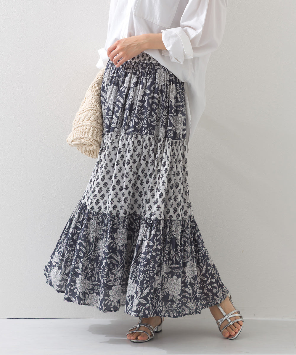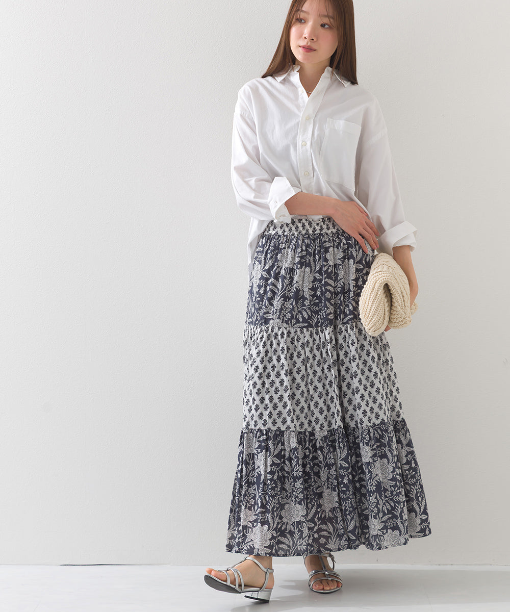 【OMNES】コットンボイル総柄切り替えティアードスカート【1525-8062】