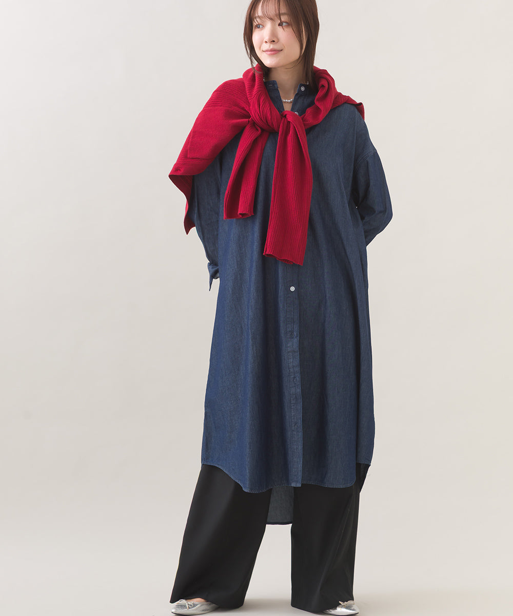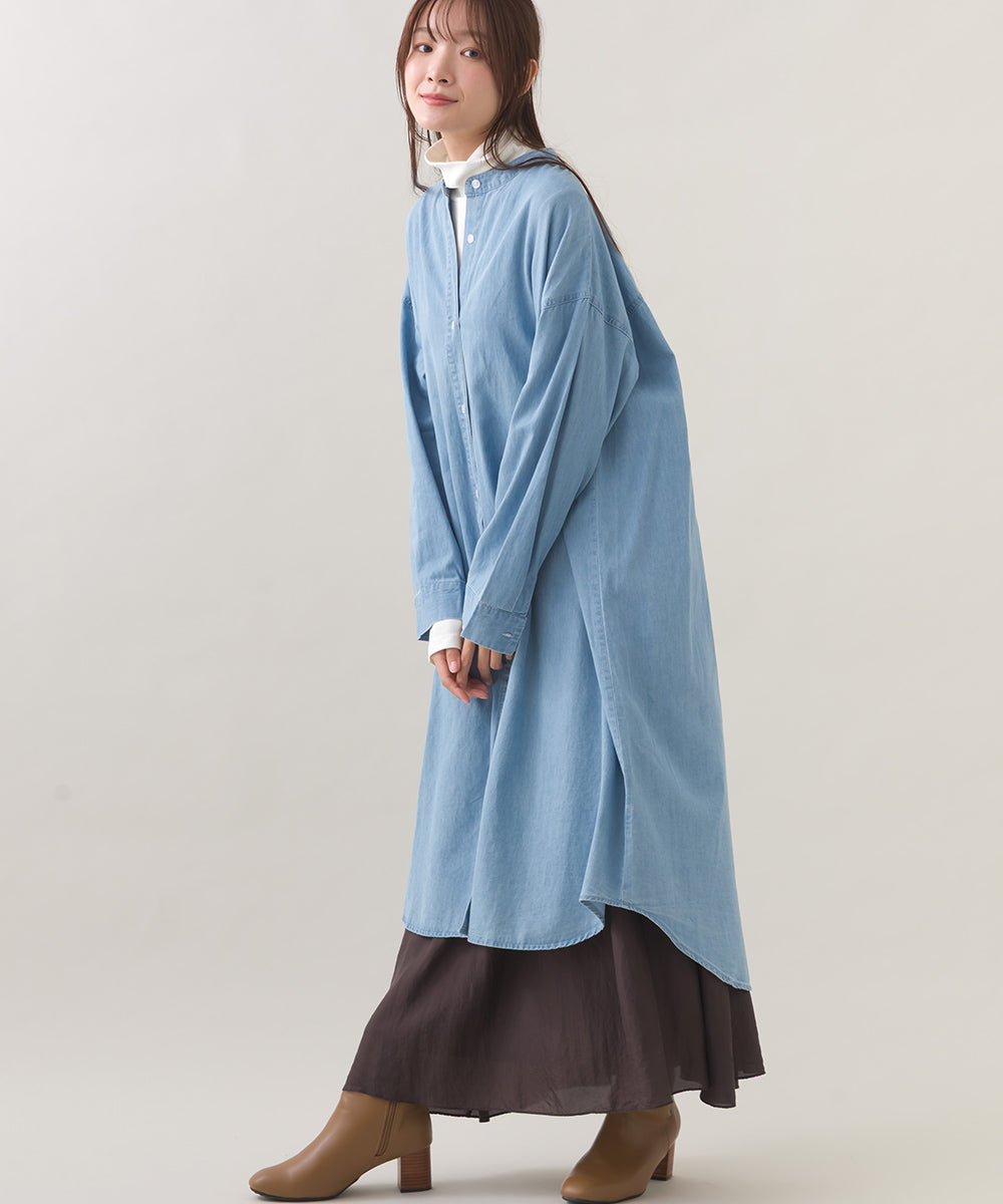 【OMNES】シャンブレーバンドカラー裾ラウンドロングシャツワンピース【253W427OMN035】