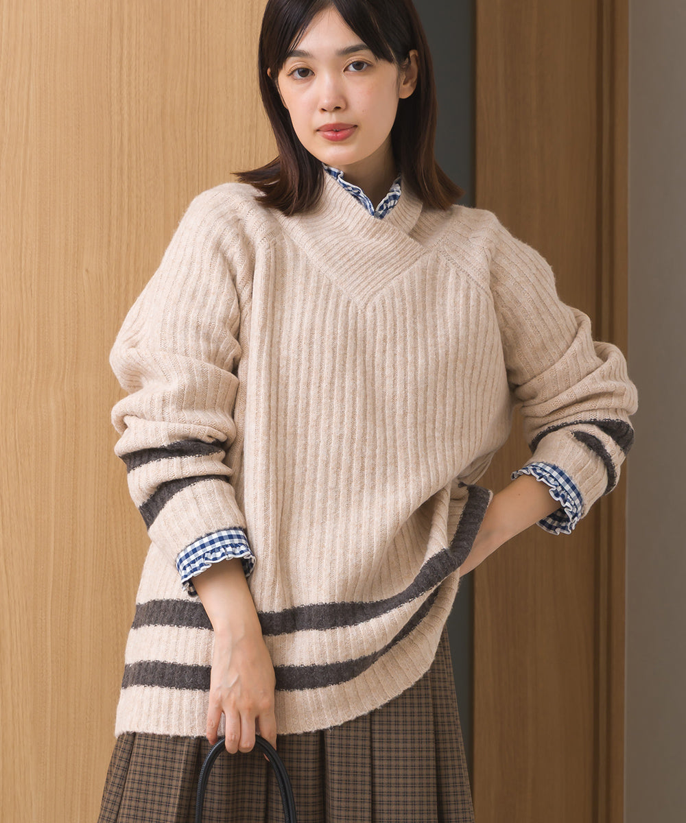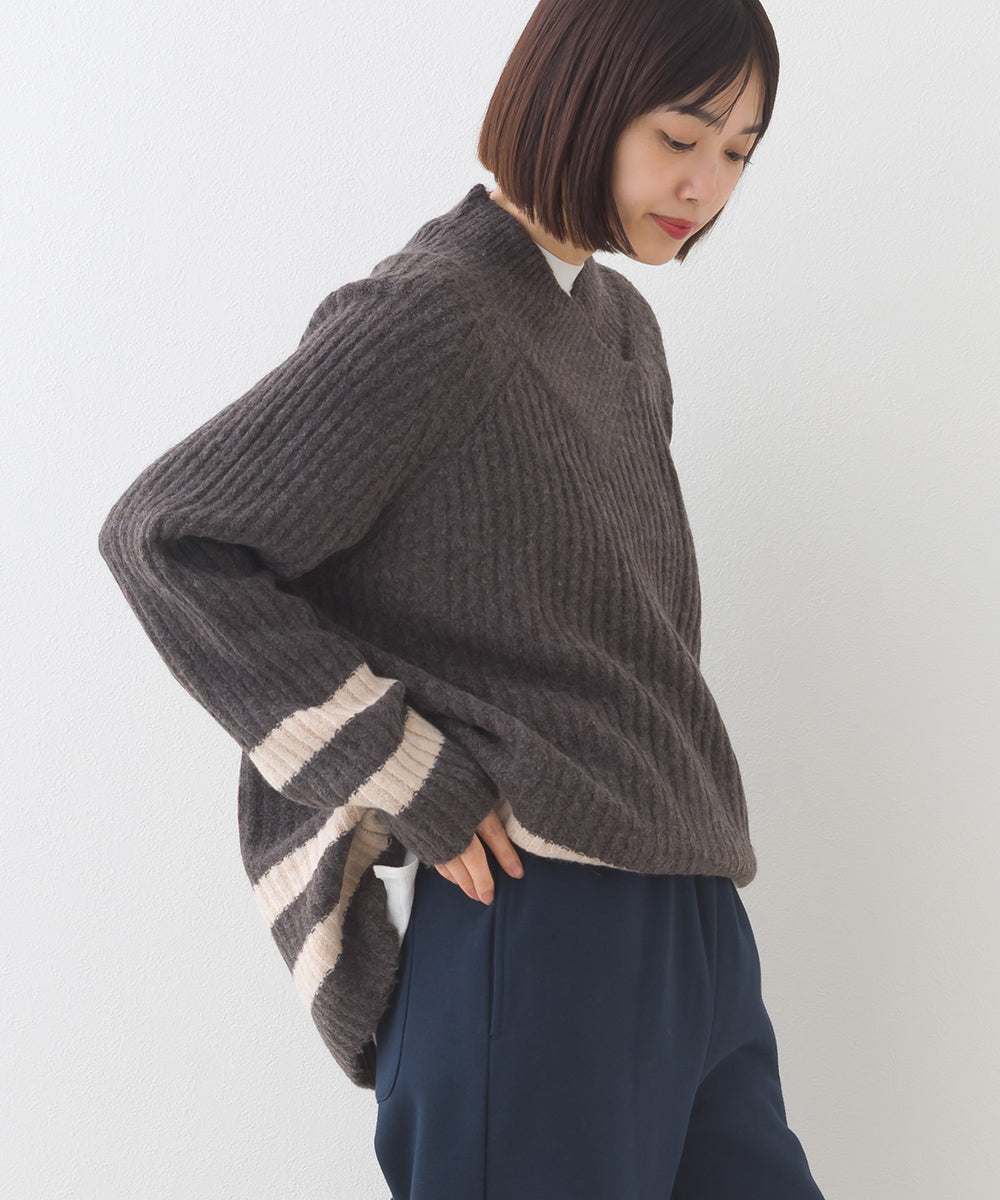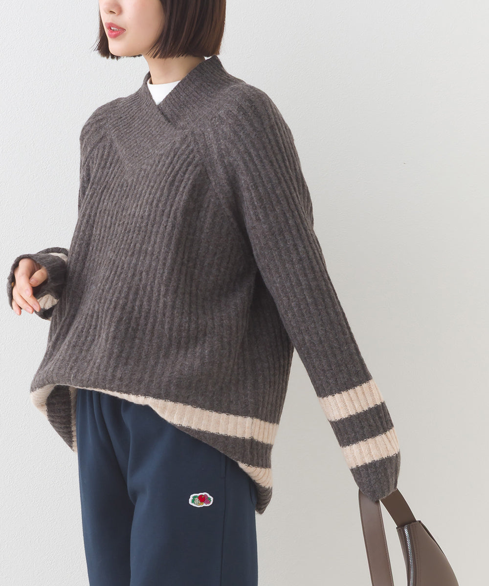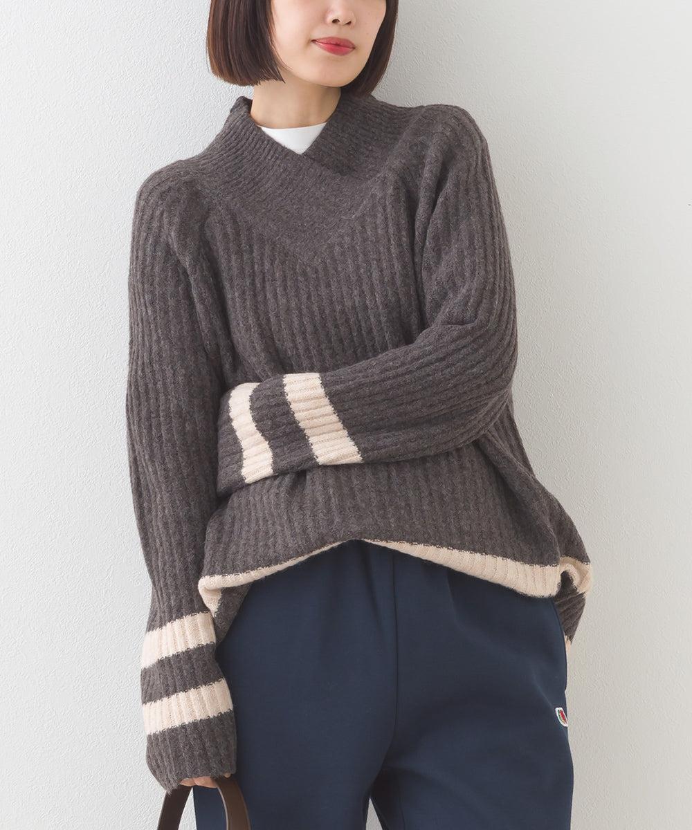 【OMNES】メランジ ショールカラー裾ボーダーニットプルオーバー【253W427OMN057】
