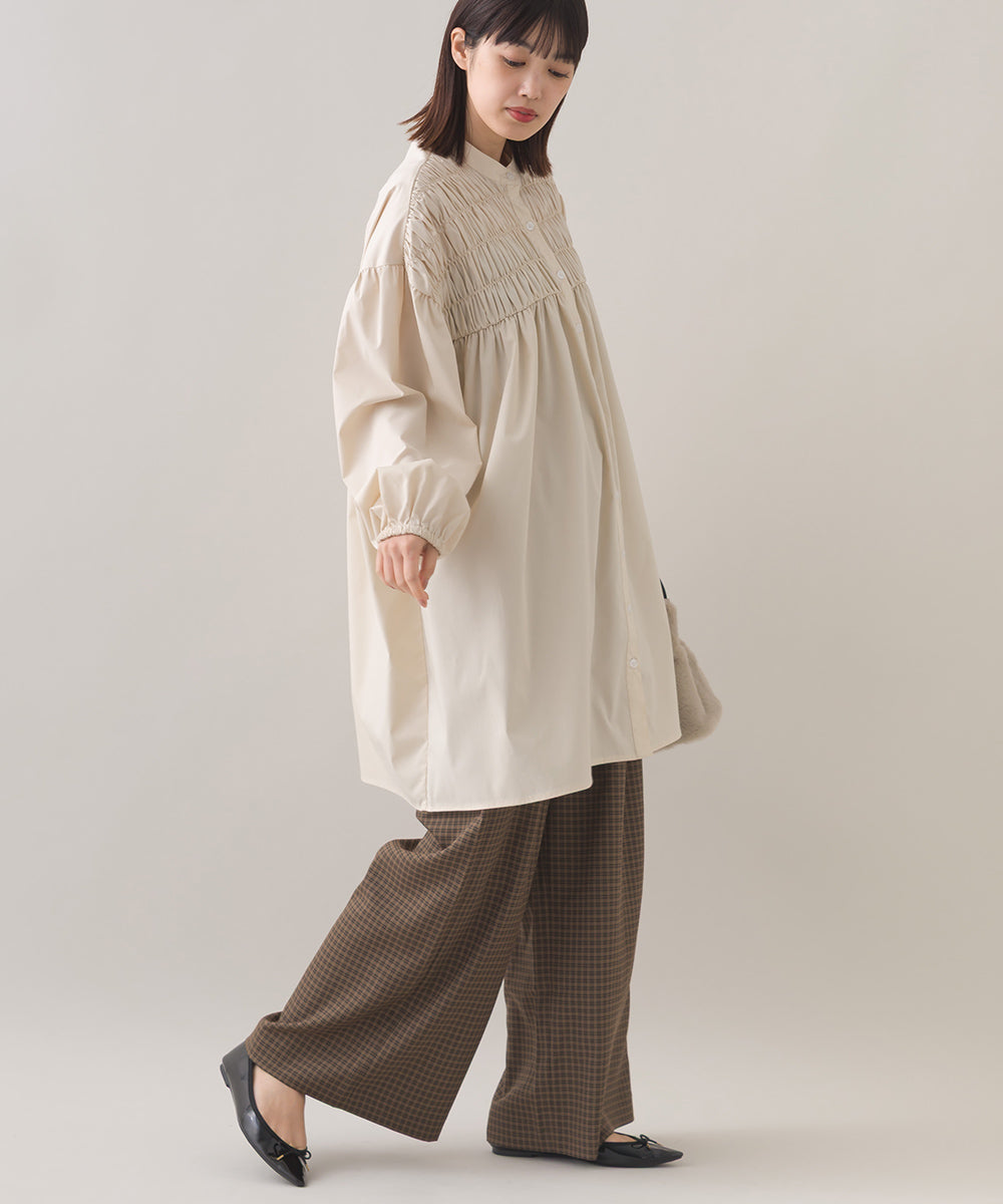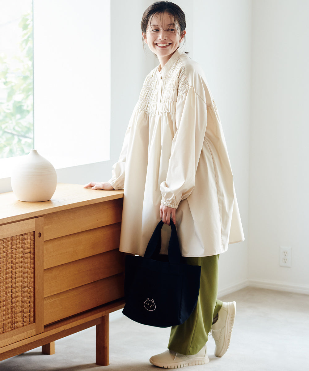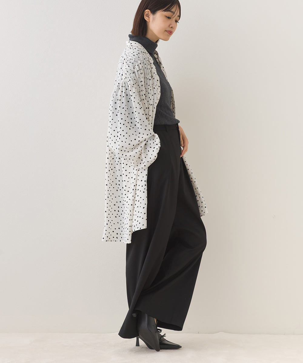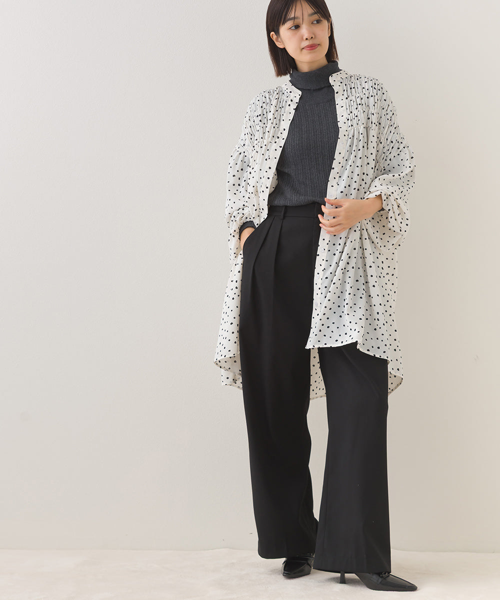 【コーディネート】 ワイドパンツと合わせてリラックス感のあるコーディネートも楽しめます。 前立てはシンプルな比翼仕立て風で、甘すぎず大人っぽい印象に仕上がります。
