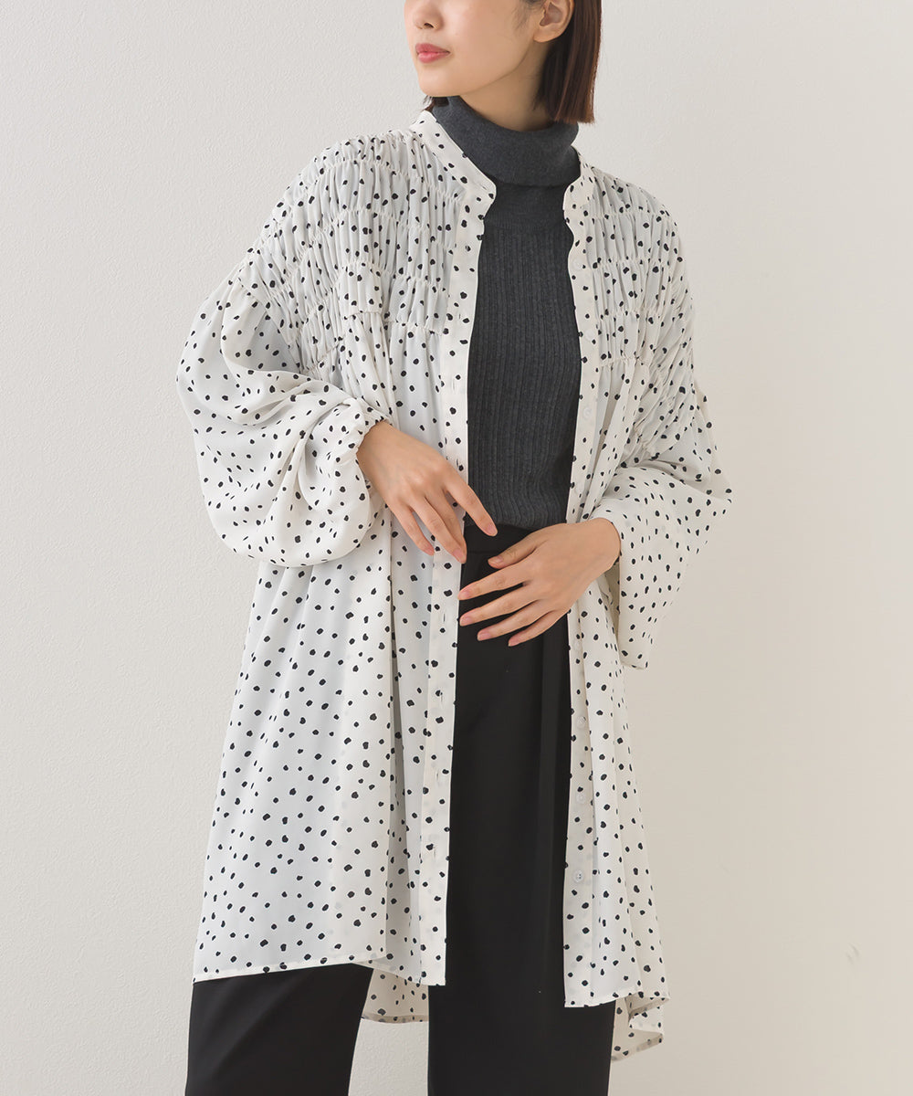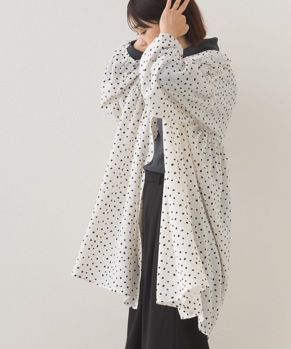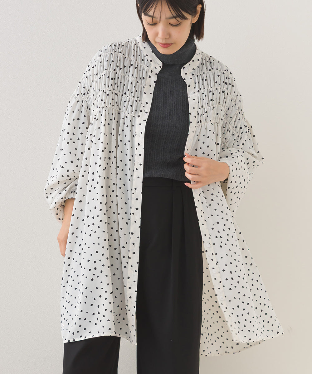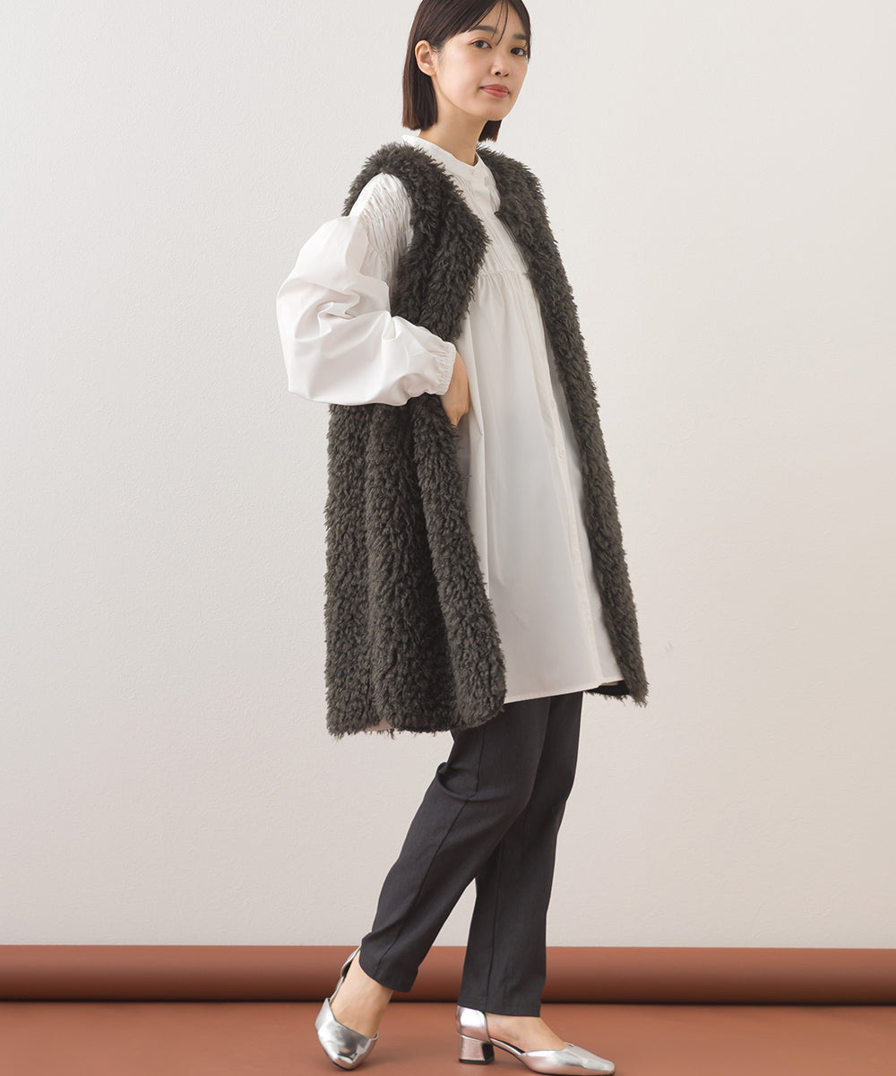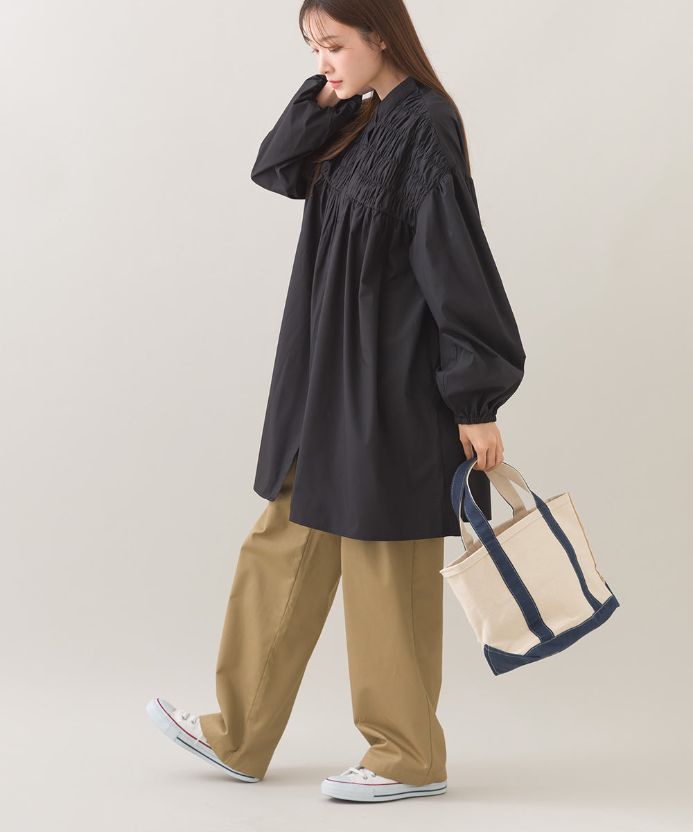 【コーディネート】 ワイドパンツと合わせてリラックス感のあるコーディネートも楽しめます。 前立てはシンプルな比翼仕立て風で、甘すぎず大人っぽい印象に仕上がります。