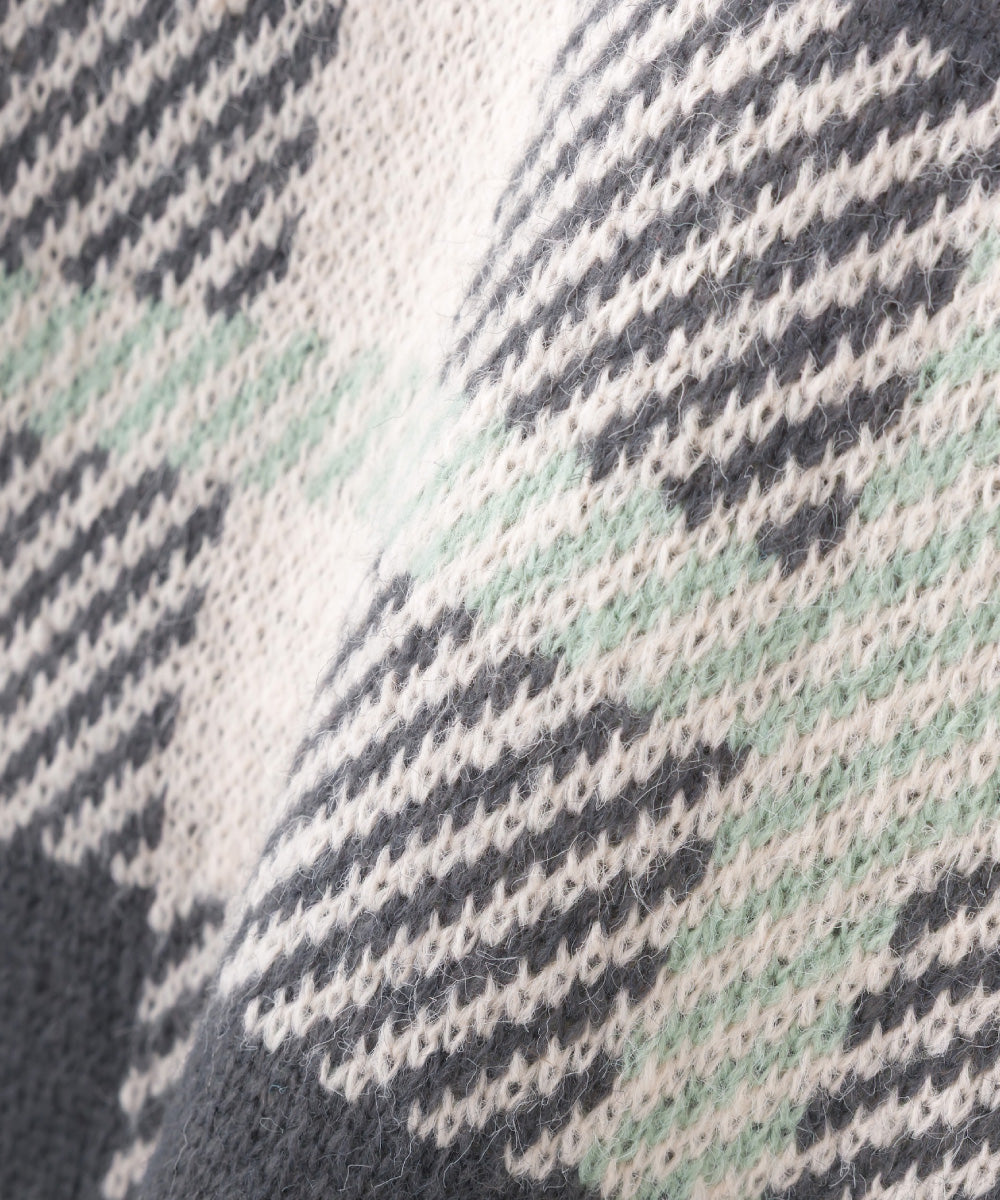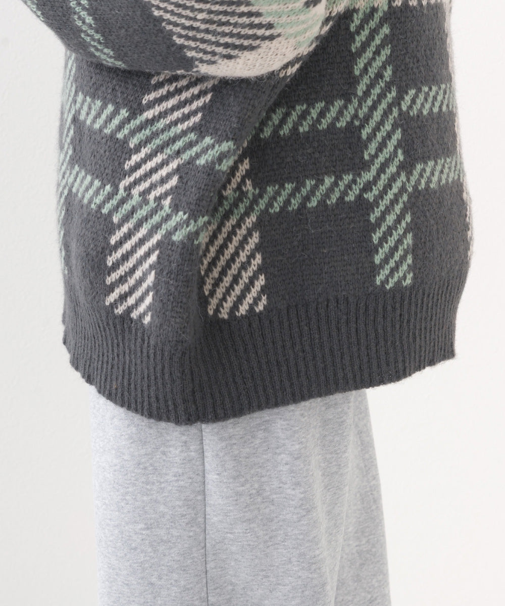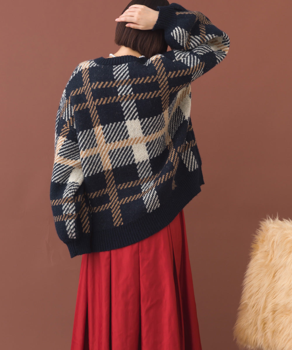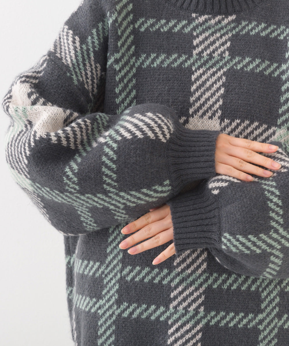 【OMNES】チェック柄シャギー オーバーサイズボリューム袖ニット【254W431OMN126】