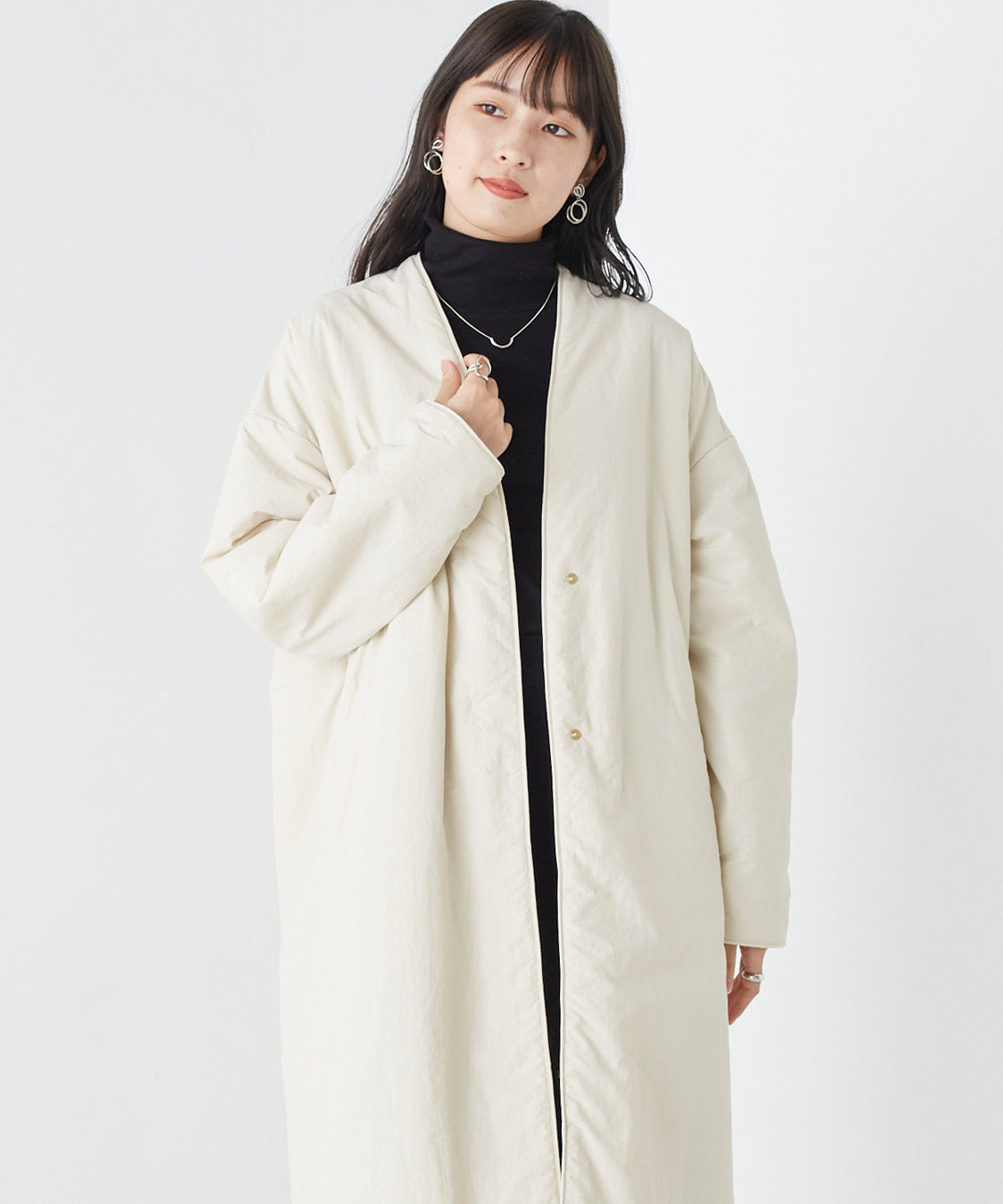 【OMNES】撥水加工ステッチレスノーカラーロングコート【7122-7138】